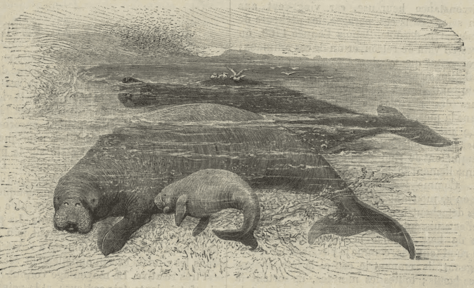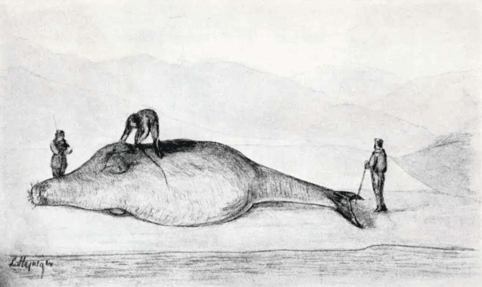 Vache de mer 2 : « G. W. Steller mesurant une vache marine en 1742 », Stejneger (1925)